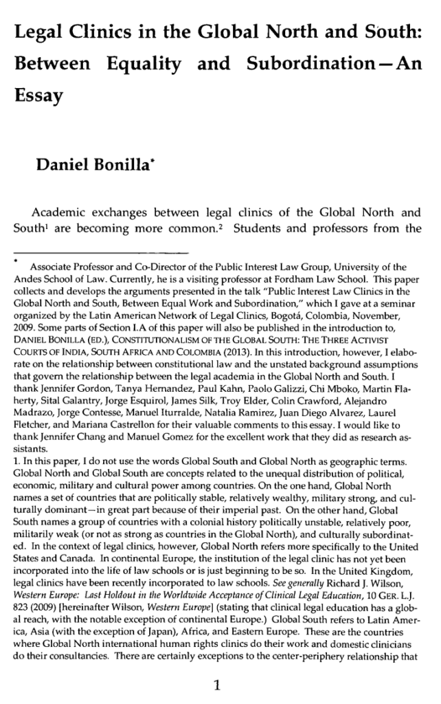 Pour consulter l’article : https://papers.ssrn.com/sol3/papers.cfm?abstract_id=2511370 (Bonilla Daniel, « Legal Clinics in the Global North and South: Between Equality and Subordination – An Essay », Yale Human Rights and Development Law Journal, vol. 16, No. 1, 2013).